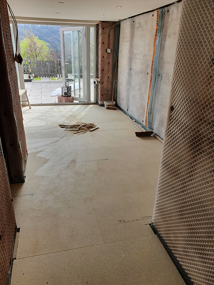 This photo shows the Weyroc floor our team has installed today at this basement in Sheffield. The final stage of this job next week will include the framework on the walls, insulation, dry-lining and plastering – 14/4/2020.